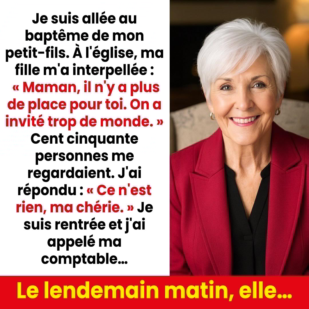 Parfois, ce ne sont pas les grandes disputes qui brisent un cœur, mais quelques mots glissés devant témoins, au pire moment. Ce jour-là, Claire, 68 ans, s’était préparée avec soin pour célébrer le baptême de son petit-fils. Elle avait tout organisé, tout financé, tout imaginé dans les moindres détails. Pourtant, à l’entrée de l’église, sa propre fille lui a lancé : « Tu n’as pas ta place, maman. » Une phrase qui change tout. Une phrase qui, paradoxalement, allait remettre sa vie sur de nouveaux rails.